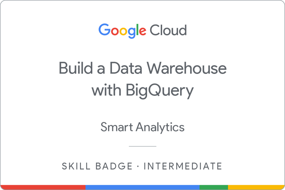 Complete the intermediate Build a Data Warehouse with BigQuery skill badge course to demonstrate skills in the following: joining data to create new tables, troubleshooting joins, appending data with unions, creating date-partitioned tables, and working with JSON, arrays, and structs in BigQuery.