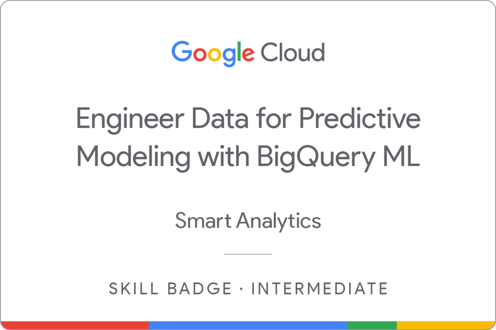 Complete the intermediate Engineer Data for Predictive Modeling with BigQuery ML skill badge to demonstrate skills in the following: building data transformation pipelines to BigQuery using Dataprep by Trifacta; using Cloud Storage, Dataflow, and BigQuery to build extract, transform, and load (ETL) workflows; and building machine learning models using BigQuery ML.