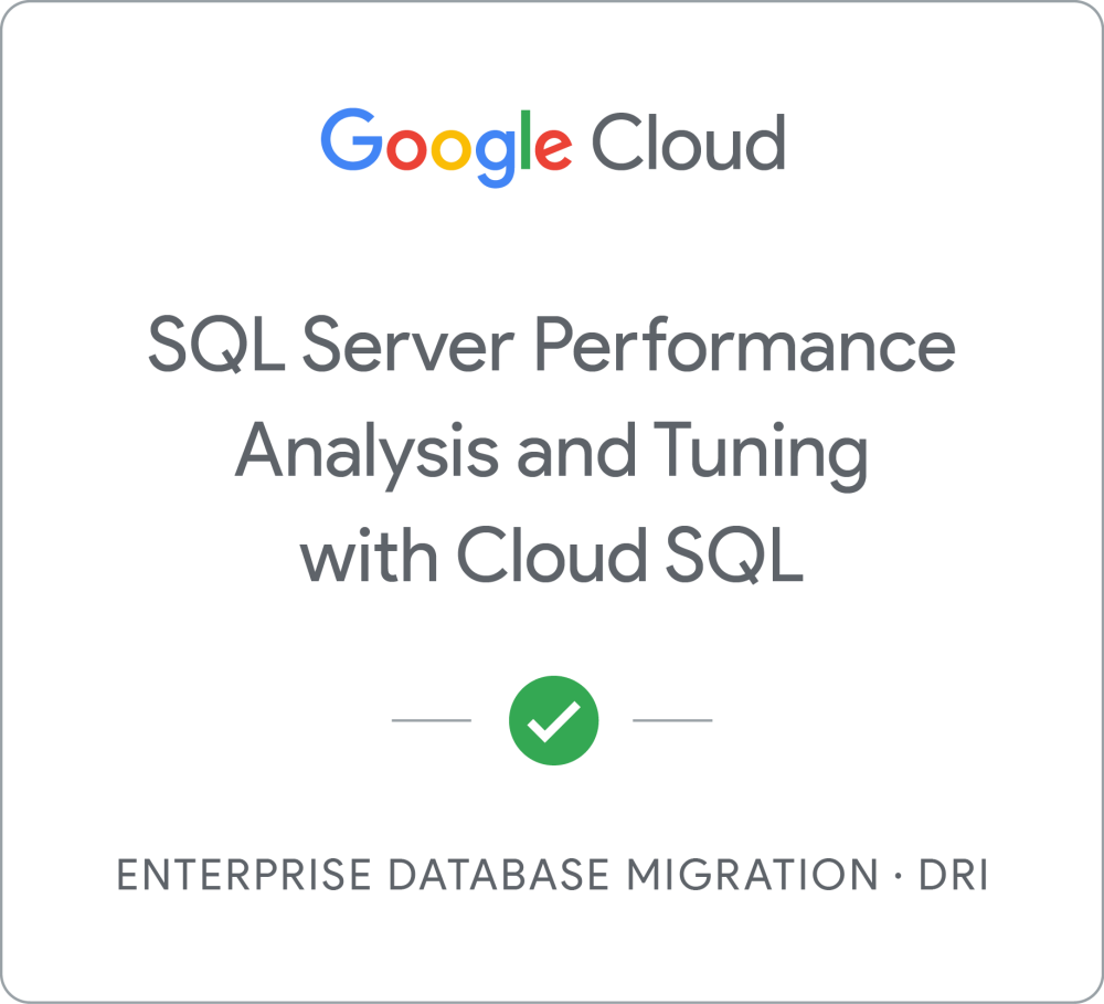 Earn a DRI badge by completing the Enterprise Database Migration - SQL Server Performance Analysis and Tuning with Cloud SQL quest, where you demonstrate your capabilities of Cloud SQL Database Performance Monitoring for SQL Server, Cloud SQL Server Database Performance Analysis for SQL Server, and Cloud SQL Database Performance Tuning for SQL Server. When you complete this activity, you can earn the badge displayed above! View all the badges you have earned by visiting your profile page.