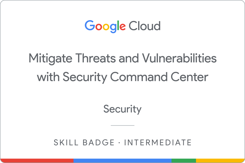 Complete the intermediate Mitigate Threats and Vulnerabilities with Security Command Center skill badge course to demonstrate skills in the following: preventing and managing environment threats, identifying and mitigating application vulnerabilities, and responding to security anomalies.
