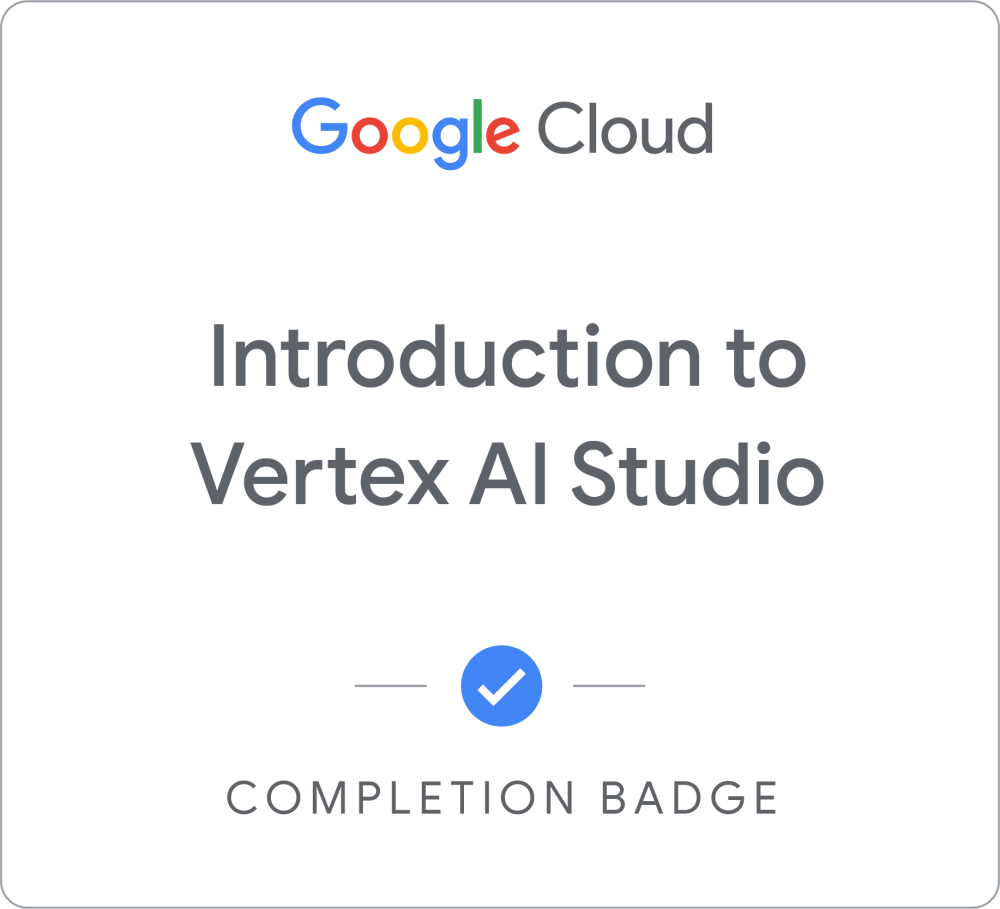 Earn a skill badge by passing the final quiz, you'll demonstrate your understanding of foundational concepts in generative AI. A skill badge is a digital badge issued by Google Cloud in recognition of your knowledge of Google Cloud products and services. Share your skill badge by making your profile public and adding it to your social media profile.