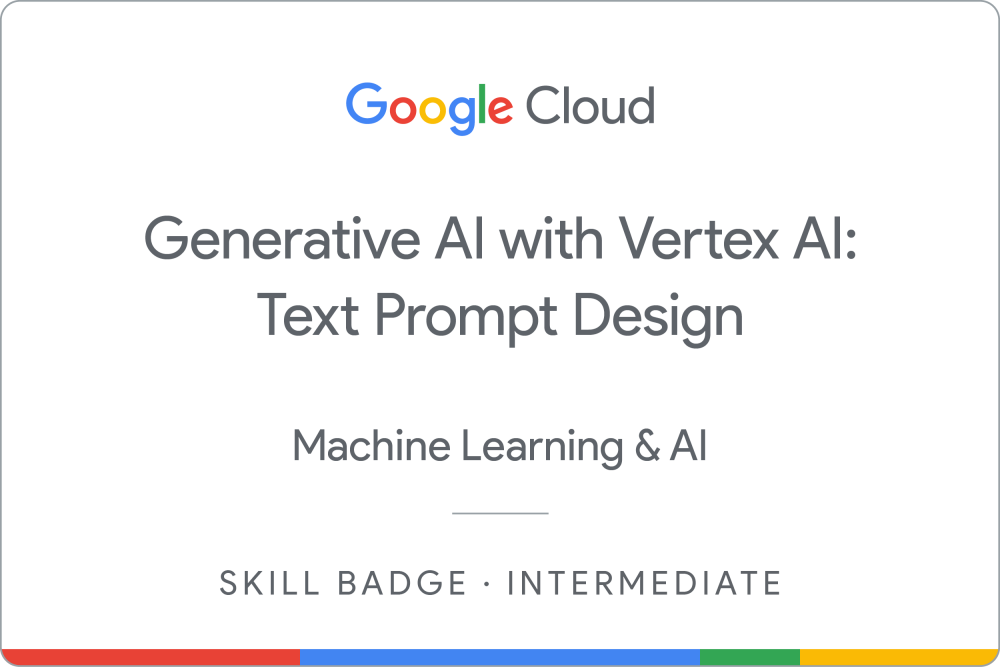 Earn a skill badge by passing the final quiz, you'll demonstrate your understanding of foundational concepts in generative AI. A skill badge is a digital badge issued by Google Cloud in recognition of your knowledge of Google Cloud products and services. Share your skill badge by making your profile public and adding it to your social media profile.